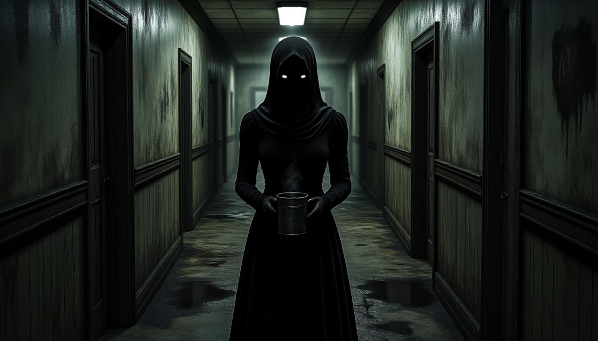 Олег направил луч фонаря наверх. В тусклом свете мы увидели ее. Высокая, грузная фигура в темной одежде. Лицо скрыто в тени платка. Она стояла на верхней площадке и просто смотрела на нас. Медленно она подняла руку. Костлявый палец указал на дверь Тихой Комнаты. А потом — на меня.