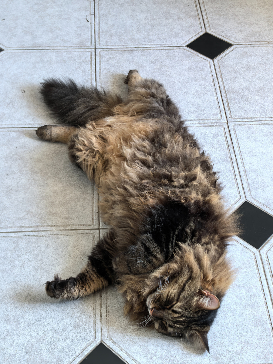 Всем привет! С вами Кузя Кусалочкин (он же царь Кузьма I). Сегодня я расскажу, как изнываю от жары. Днём становится очень жарко. Поэтому я активничаю ночью. Но вот беда — людишки мои ночью спят, а мне скучно. Пришёл, потоптался по ним. Хозяйка проснулась, погладила меня, я ей помурчал. Но вот играть со мной никто не стал. Эх... Утром, как всегда, я позавтракал паштетиком (подавали на царской тарелке). А ещё попросил сливочки. Хозяйка занималась своими делами, а я не мог найти себе место, потому что становилось жарко. Сначала развалился вот так на кухне: Потом стал тулиться к холодильнику: Хозяйка была удивлена, ведь холодильник у нас греется. Стала хозяйка мочить тряпки и рядом на пол класть, меня водой брызгала. Но мне это жутко не понравилось. Я ушёл на балкон и вот так спрятался: Хозяйка понимала, что мне уже ну очень жарко. Уговаривала меня пойти в комнату. Даже брала на руки и относила, рассказывала, что там прохладнее. Но я упорно возвращался сюда, на балкон. Хозяйка бегала во