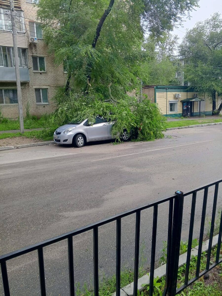 По улице Кручинина, возле дома №3, для владельца припаркованного автомобиля, утро началось не с лучших новостей. На автомобиль рухнула часть дерева повредив крышу автомобиля.