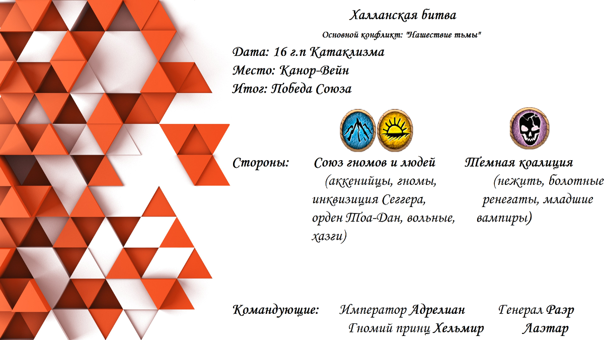 Событие между 15-16 г.п. Катаклизма, в ходе которого произошла самая крупная битва с момента катастрофы - Халланская Битва (Битва у Канор-Вейна) __________________________________________________________________________________________ Кампания против Раэра, 15 г.п Катаклизма, состояла из нескольких сражений: * Сражение в ущелье Крейд-Моор * Халланская битва (ключевое сражение) * Битва при Энтарне Канор-Вейн - маленькая имперская деревушка, возведенная ещё до Катаклизма в речной долине, между горами Казыллак-Андымом и Цвергондом. Расположена на выходе из Халланского горного массива и является крайним поселением империи на севере. Канор-Вейн занимает важное стратегическое место в центре долины что дает возможность использовать поселение как опорную точку и наблюдательный пункт. Армия Адрелиана использовала деревню в качестве приграничного оборонительного рубежа где разместила свои легионы. О маршруте следования Раэра и месте его атаки стало известно благодаря разве