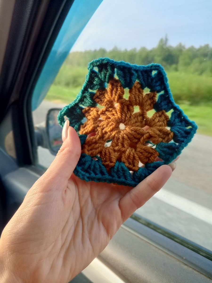 Доброе утро! Поехали в город. Взяла в дорогу новые моточки, начала второй шестиугольник. Первый ещё не довязала, но в машине удобнее вязать, когда детали поменьше.