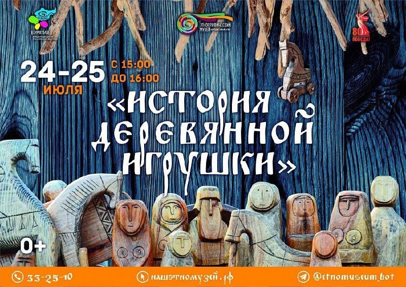 Выставка-лекция «История деревянной игрушки» в Этномузее 24 и 25 июля Этнографический музей приглашает на увлекательную выставку-лекцию «История деревянной игрушки» Мероприятие состоится в городском комплексе «Дом Танских» с 15:00 до 17:00, продолжительностью 45 минут. В программе познавательная лекция и выставка работ мастера по дереву Ирины Акинфеевой. На выставке будут представлены авторские изделия, выполненные с мастерством и любовью к традициям. Мероприятие бесплатное для всех посетителей музея. Не упустите возможность расширить свои знания о культуре и искусстве народов Забайкалья и мира! 0+