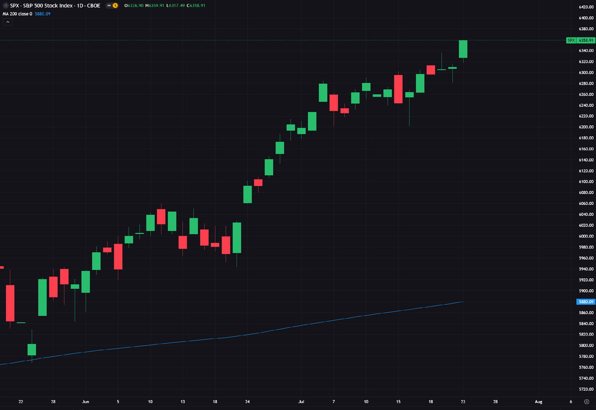 S&P 500 вчера достиг своего 11-го исторического максимума с начала года, продолжив впечатляющий рост, начавшийся всего несколько месяцев назад. Опасения по поводу влияния пошлин на мировую экономику полностью развеялись, и здесь мои ожидания не оправдались, т.к. предполагалась хорошая коррекция, когда это влияние станет видно из отчётов.