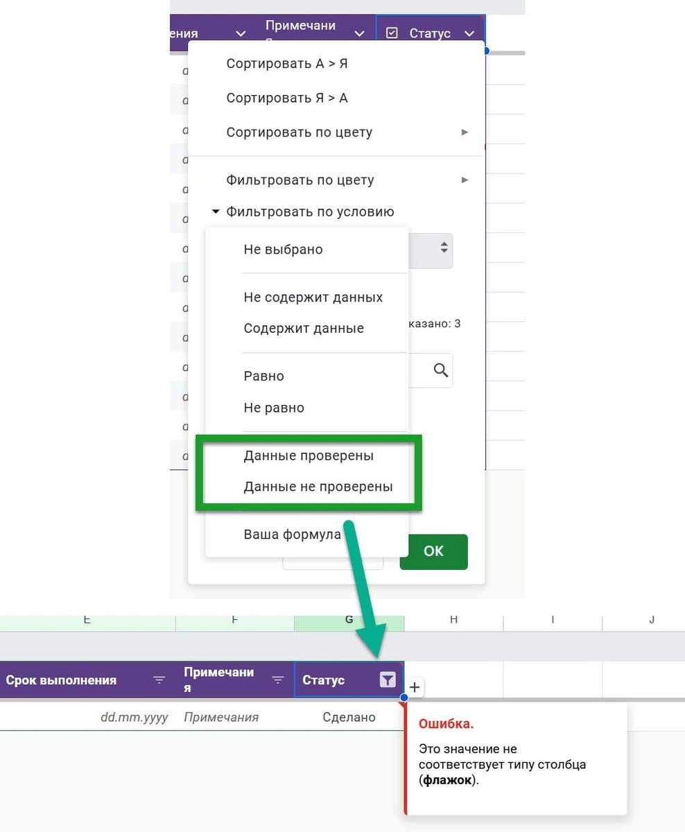 Новая опция в фильтрах таблиц: можно выбрать строки с ячейками, соответствующими правилу проверки данных в столбце или с ошибочными данными