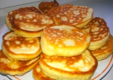 Ингредиенты: - 2 стакана простокваши - 2 стакана муки - ½ ч. л. соды - 4 яйца - сахар - соль - 4 ст. л. жира Приготовление: Простоквашу смешать с мукой, ввести туда желток, добавить пищевую соду, немного соли и сахара, всё хорошо размешать до однородности. Затем отдельно взбить белок до пышной пены, аккуратно вмешать его в подготовленное тесто. Сковороду нагреть, смазать жиром, выложить небольшие порции теста с помощью ложки и обжаривать оладьи с двух сторон до золотистого цвета.