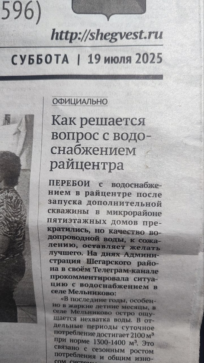 «В последние годы, особенно в жаркие летние месяцы, в селе Мельниково остро ощущается нехватка воды. В отдельные периоды суточное потребление достигает 2100 м³ при норме 1300–1400 м³. Это связано с сезонным ростом потребления и общим износом системы водоснабжения. В начале июня текущего года для стабилизации ситуации был введён даже график подачи воды.