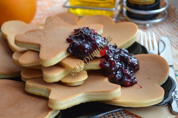 Панкейки с клюквенным конфитюром Ингредиенты: Мука - 250 гр. Сахар - 75 гр. (3 ст. л.) Разрыхлитель теста - 12 гр. (1 ч. л. или сода 05 ч. л.) Соль - 5 гр. (0,5 ч. л.) Яйцо - 3 шт. Масло оливковое - 40 мл. (2 ст. л.) Пахта - 250 мл. (или молоко) Масло сливочное - 60 гр. (для конфитюра) Сахар - 100 гр. (для конфитюра) Клюква - 200 гр. (для конфитюра) Источник: https://rusdinner.ru/page/pankejki-s-kljukvennym-konfitjurom