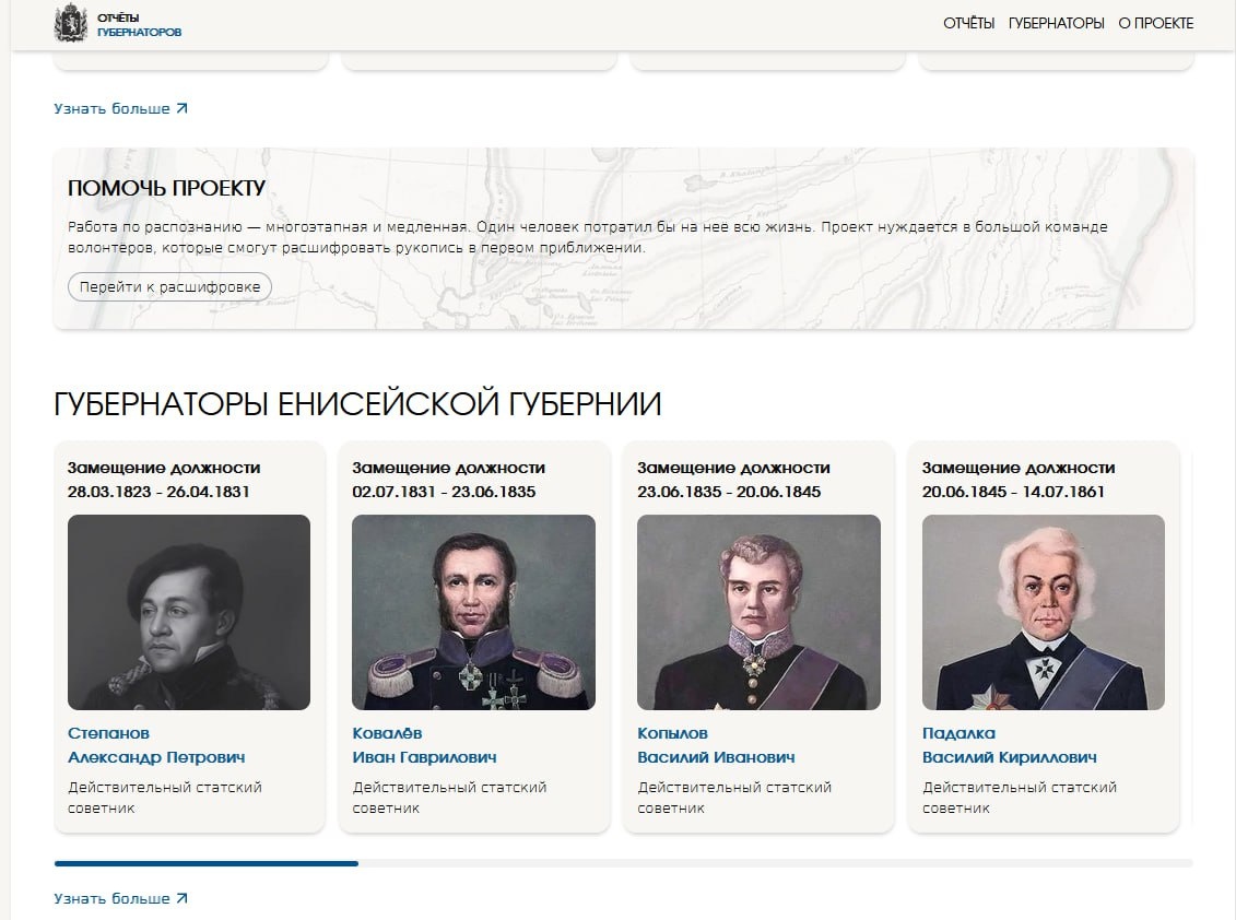 Каждый может ознакомиться с содержанием губернаторских отчетов, прошедших все этапы работы с ними, на сайте «Отчеты губернаторов Енисейской губернии» (govreport.sfu-kras.ru), разработанном сотрудниками лаборатории DHlab. Кроме отчетов на сайте можно найти краткую биографическую информацию о губернаторах Енисейской губернии.