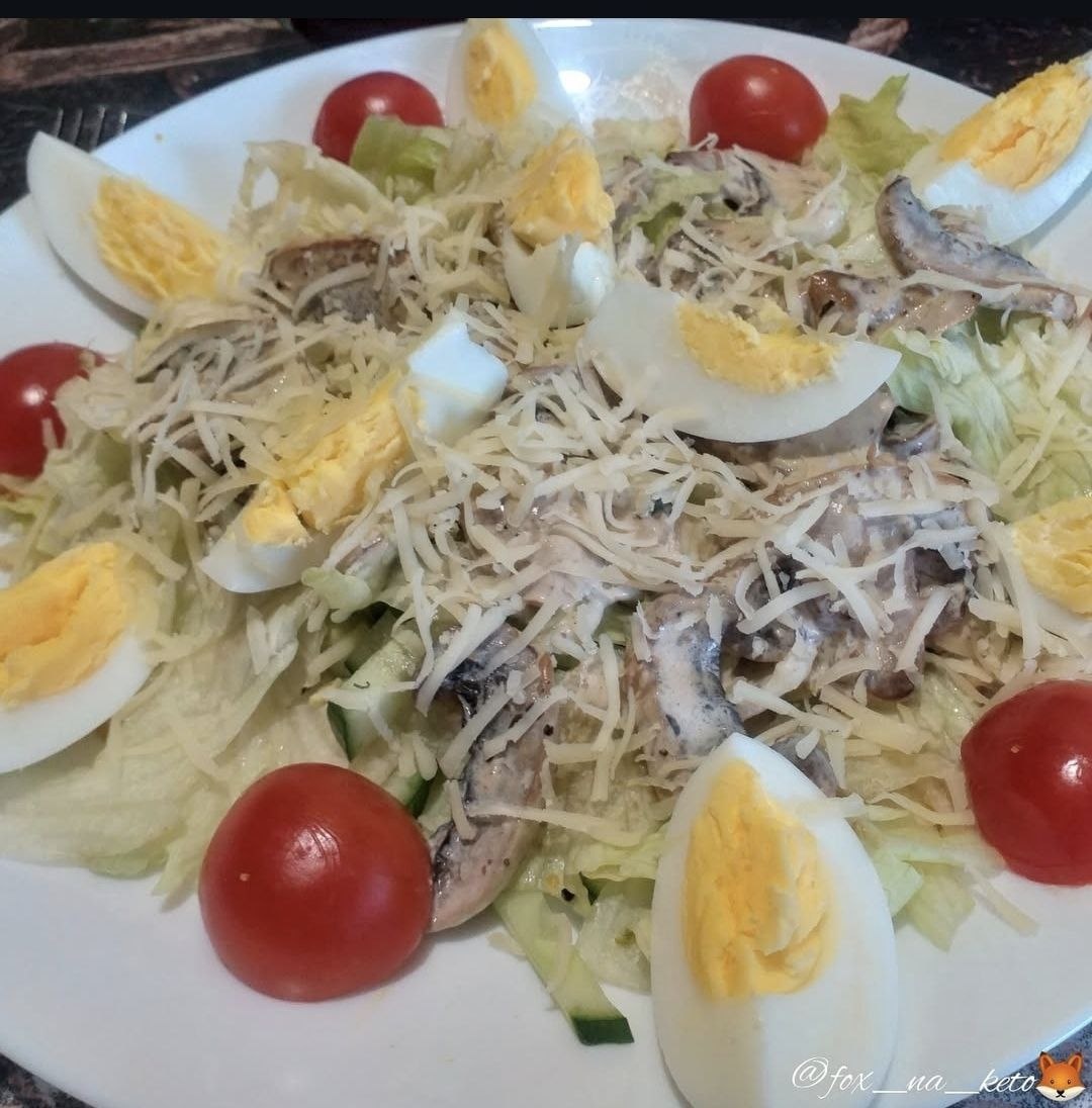 САЛАТ А-ЛЯ ЦЕЗАРЬ С ГРИБАМИ Эксперимент удался! Получилось очень сочно, вкусно и сытно. Ингредиенты (1 порция): 📌 яйца варёные 2 шт 📌 помидоры черри 3 шт 📌 орурец 30-50 гр 📌 листья айсберга 3-4 шт 📌 горчица по-дижонски 1 ст.л. (или дом. майонез) 📌 шампиньоны 2 крупных 📌 сливки 33% 20-30 мл 📌 соль, перец по вкусу 📌 сыр твёрдый 20 гр Приготовление: Грибы нарезать пластинками, обжарить на сильном огне с двух сторон до румяности, влить сливки, посолить, поперчить, довести до кипения и выключить. Листья айсберга порвать, добавить к ним, порезанный соломкой, огурец, горчицу и перемешать. Сверху выложить шампиньоны, половинки черри и нарезанные на четвертинки яйца, посыпать натёртым сыром. ПРИЯТНОГО АППЕТИТА