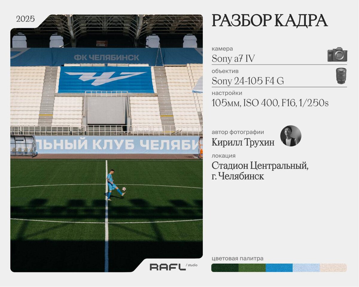 Хвалить «Челябинск» не только модно, но и приятно. В недавней беседе с креативной командой клуба мы сами убедились в обоснованности комплиментов Новый повод для внимания к «Челябинску» — работа фотографа Кирилла Трухина, который в значительной мере формирует обновленный визуальный образ клуба Специально для нашей рубрики «Разбор кадра» Кирилл делится подробностями создания сложносочиненной композиции на «Центральном» стадионе «Этот кадр сделан во время медиа дня после ребрендинга клуба. Хотелось передать масштаб изменений: новая форма, новый логотип, обновлённый визуальный стиль. Первым делом взгляд зацепился за новый логотип на трибунах. В поиске правильной композиции, двигаясь по противоположной стороне стадиона, я нашёл нужный ракурс. Оставалось только позвать игрока на центр поля и всё сошлось» 👌rafl.studio