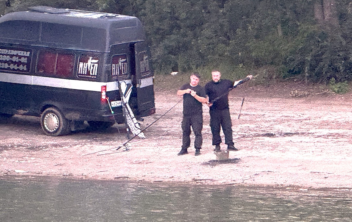 Автомобиль, предназначенный для организации похорон, был зафиксирован на фото в минувшие выходные. Читатель «Новой Сибири» заметил его и начал приближаться к берегу на катере, после чего два сотрудника похоронного дома в униформе достали рыболовные снасти.