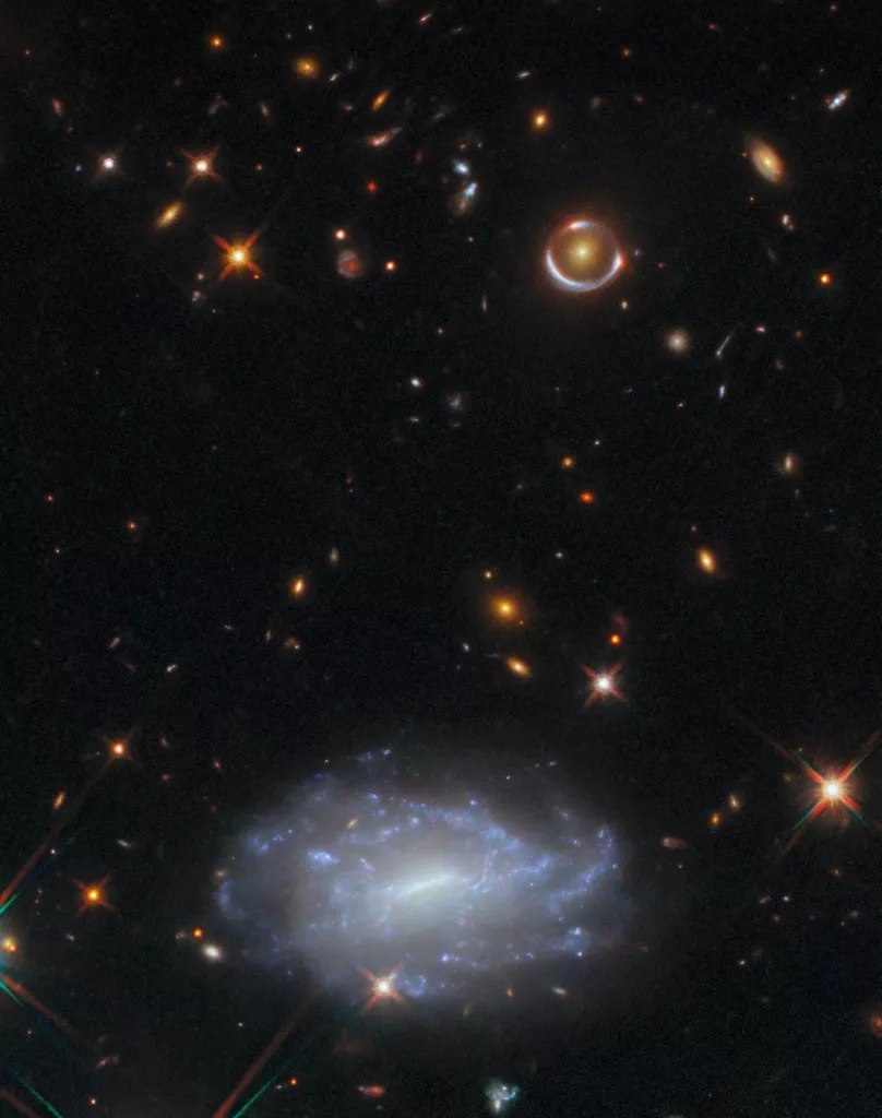 На снимке Гидры, полученном телескопом «Хаббл», видны близлежащие звёзды Млечного Пути и далёкая галактика, изогнутая в почти идеальное кольцо Эйнштейна. Мы видим это кольцо таким, каким оно было, когда Вселенной было всего 2,5 миллиарда лет.