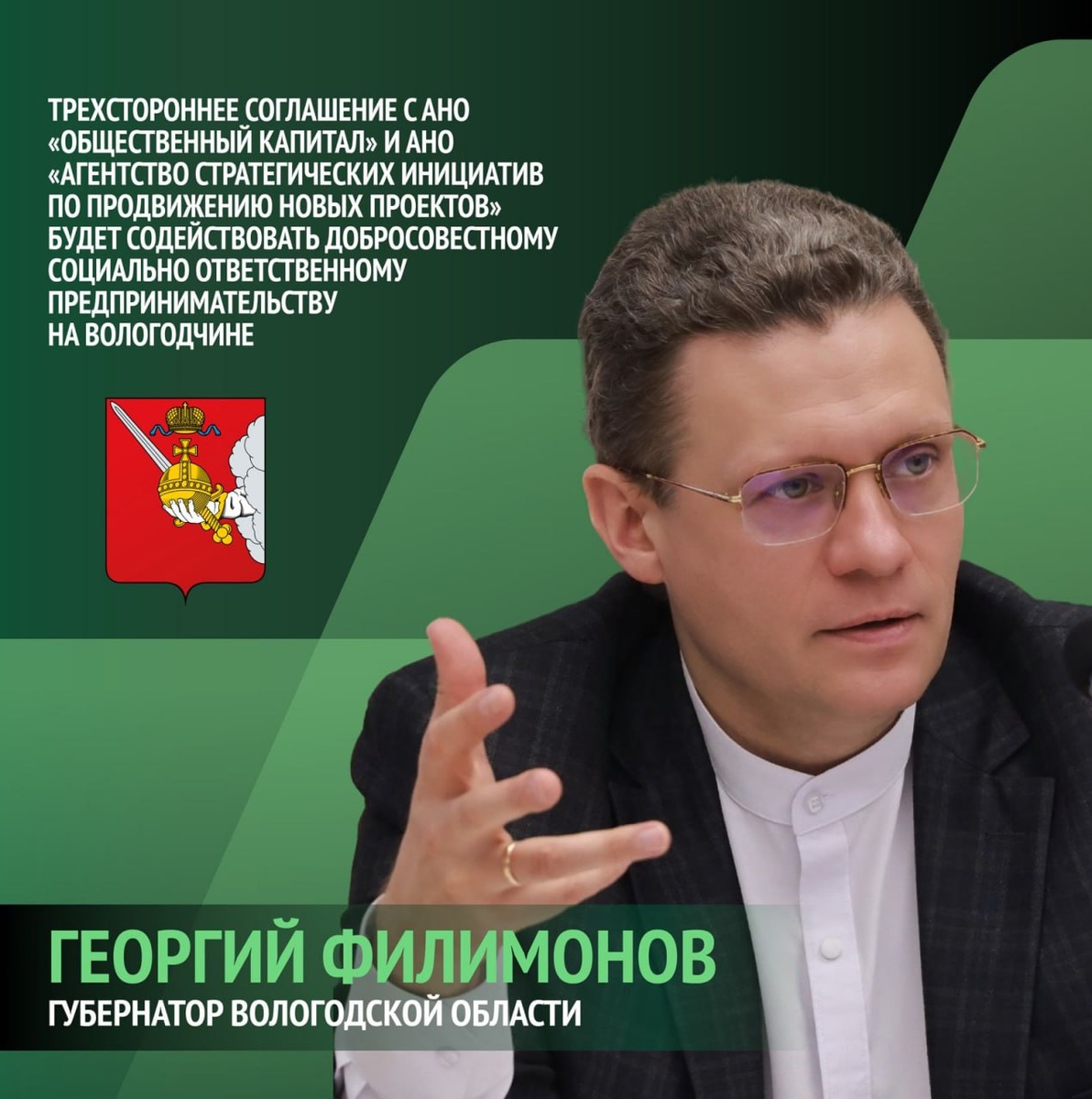 Губернатор Вологодской области Георгий Филимонов: «Малое и среднее предпринимательство – важная составляющая экономики Вологодской области. 217,5 тыс. вологжан заняты в малом и среднем бизнесе – 40% от общей численности занятых в областной экономике. В регионе действуют 48,1 тыс. субъектов МСП. Доля оборота МСП в общеобластном обороте составляет 23%. Мы работаем в прямом контакте с предпринимательским сообществом, слышим запросы, совершенствуем системы мер поддержки. Подписанное трехстороннее соглашение с АНО «Общественный капитал» и АНО «Агентство стратегических инициатив по продвижению новых проектов» будет содействовать добросовестному социально ответственному предпринимательству на Вологодчине – это один из приоритетов работы команды областного Правительства. Совместными усилиями будем расширять и укреплять поддержку бизнеса, а также крупных инвесторов, реализующих проекты в различных отраслях экономики региона»