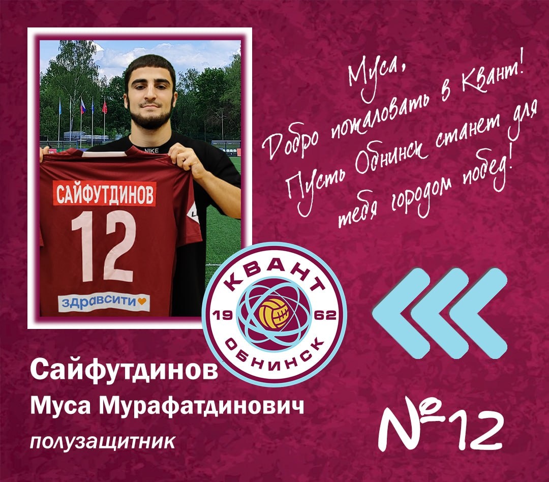 Итак, кто же он? Муса родился в Ставропольском крае. Начал заниматься футболом в 10 лет, а в 13 начал играть за пятигорский «Машук КМВ» за свой 2006 год. В 2022 году попал в «Академию футбола» города Тамбова, где через 2 года подписал первый профессиональный контракт с тамбовским «Спартаком». После первого сезона во Второй лиге, этой зимой перебрался в пензенский «Зенит», за который молодой левый вингер сыграл 8 матчей. И вот теперь Сайфутдинов примеряет футболку обнинского «Кванта». Приветствуем Мусу в Обнинске! 👏
