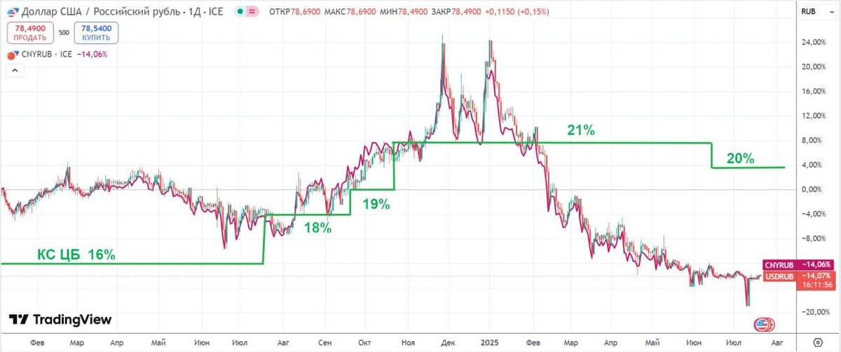 Пока еще не пошел вал отчетов за полугодие, а весь рынок ждет сегодняшнего решения ЦБ РФ по ключевой ставке, я хочу подумать о том, какие сценарии у нас возможны. Ситуация в экономике более чем непростая, мы все это видим в отчетах компаний и исследованиях ЦБ, ДОМ РФ и многочисленных отраслевых отчетах. Приток валютной выручки на продажу внутри России велик. Экспортерам нужны деньги на финансирование работы внутри страны, вот они и продают юани в объемах выше прописанного в требованиях Правительства. Здесь перелома тренда и близко не видно, тем более, многие траты росли — ФОТ, «расходники» (рост денежной массы не прошел бесследно). Процесс снижения ставок начался. Да и инфляция уже мельком показала SAAR на уровне 4%. Да, это было в самом слабом с точки зрения роста цен летнем месяце, но все же цифра коснулась бумаги, а это один из факторов решения в пользу ослабления ДКП. ОФЗ уже заложили выход на 15% по ключу. В ближайшие полтора года можем и дойти и до 12%. Такая ставка уже оживит и