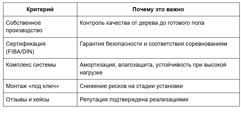 Спортивный паркет — это сложная система, рассчитанная на высокие нагрузки, амортизацию, безопасность и долговечность. От выбранного производителя зависят технические характеристики покрытия, качество монтажа и способность выдерживать интенсивную эксплуатацию. 1. Собственное производство и полный цикл. Надёжные компании имеют своё деревообрабатывающее производство — от сушки древесины до финишного лакирования. Пример: Фабрика «Ясень» — отечественный производитель с собственной сушильной камерой, столярным цехом и покрасочной линией. 2. Сертификация и соответствие стандартам. Покрытия должны быть сертифицированы по нормам FIBA, DIN, EN, а сырьё — иметь экологические сертификаты. «Ясень» предлагает системы «Эксперт» и «Экстра», соответствующие даже самым высоким спортивным стандартам EN и FIBA. 3. Конструктивные системы и многослойность. Лучшие покрытия — это многослойные конструкции с гидроизоляцией, амортизаторами, фанерой и несколькими слоями лака: 4. Опыт и репутация. Надёжный произво