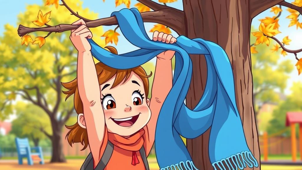Маша бесстрашно каталась, подпрыгивая на скрипучих качелях. Порывы воздуха развивали её волосы и играли с шарфиком. Вдруг особенно сильный порыв ветра сдёрнул шарфик с шеи и взметнул его высоко, прямо на кривую ветку молодого клёна у площадки. Теперь шарфик болтался над землёй, будто настоящий флажок — ветер то натягивал его, то отпускал.