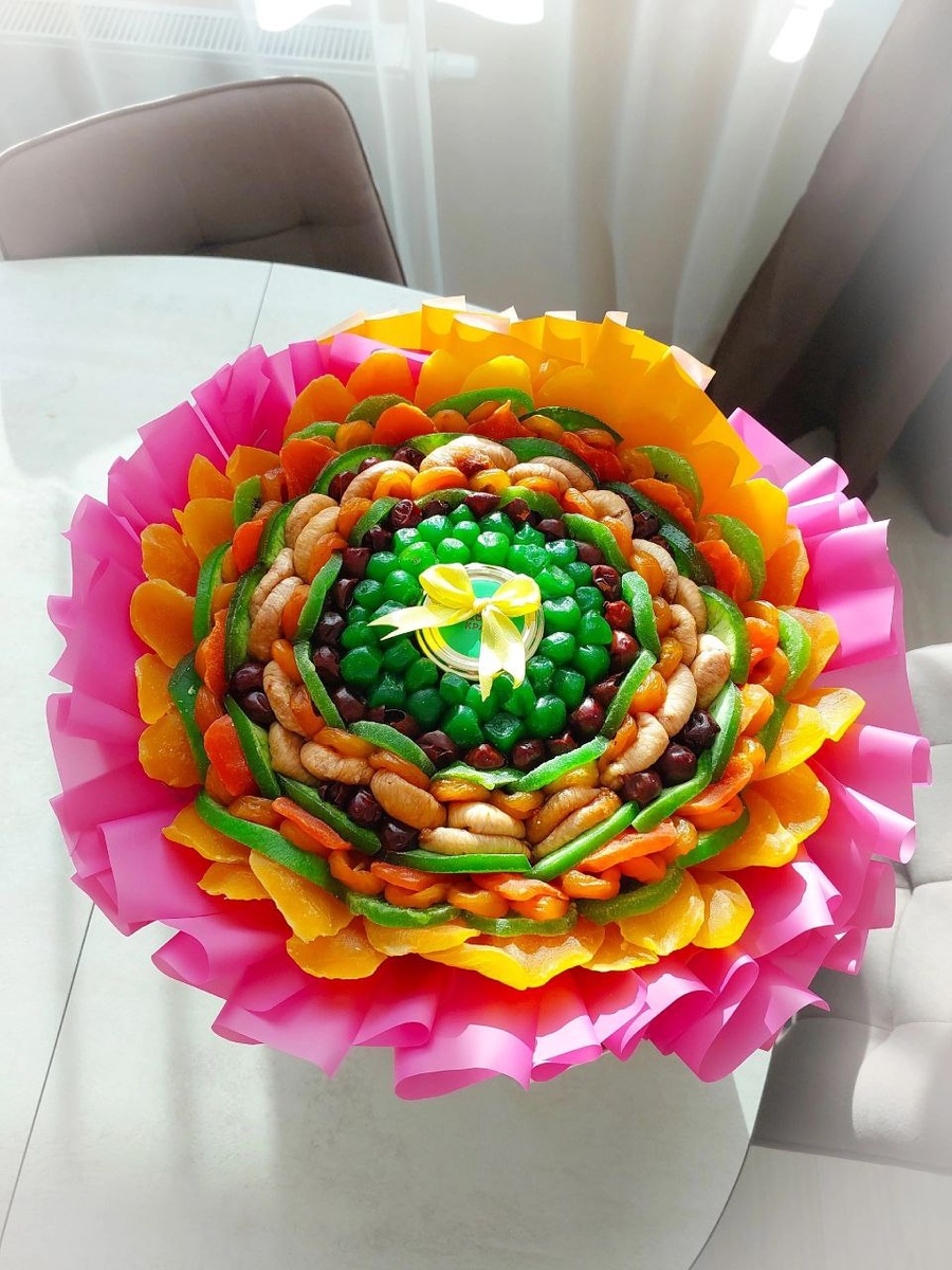 Популярность и ценность съедобного букета Представьте себе вкусный букет, который радует глаз, согревает сердце и приносит пользу организму! Именно такими становятся съедобные композиции, наполненные сухофруктами, орехами, свежими фруктами, ягодами. Такие подарки давно завоевали популярность среди ценителей здорового образа жизни и необычных сюрпризов.