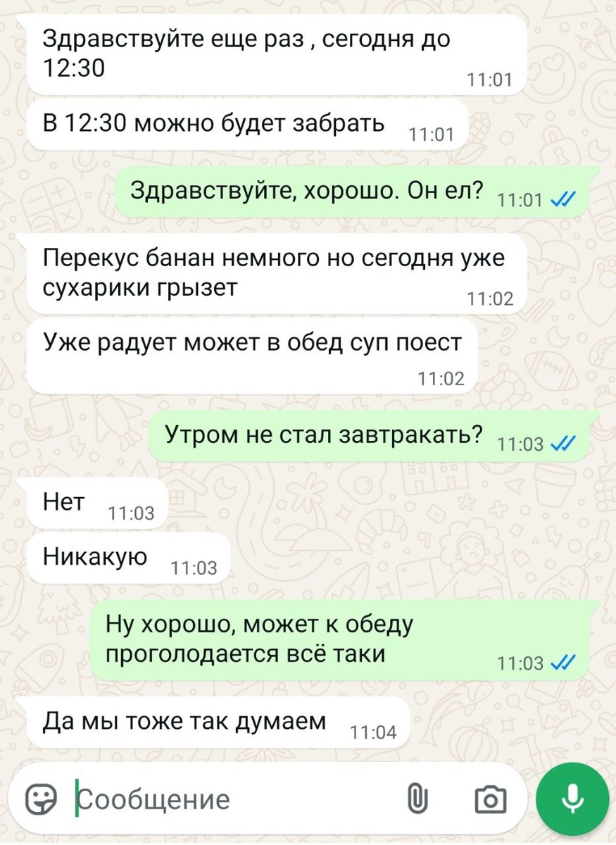 Забрала в 12:30, Арсения очень хвалили сегодня, плакал только утром, ел суп, почти всё съел. Перед обедом первый шёл мыть руки, уже начинает осваиваться в группе, ко мне подошёл, говорит: мама, мама, сначала не плакал, но в итоге похныкал чуть, спокойно попрощался с воспитателями и мы ушли. Ходил на горшок, только одни мокрые штаны 😁