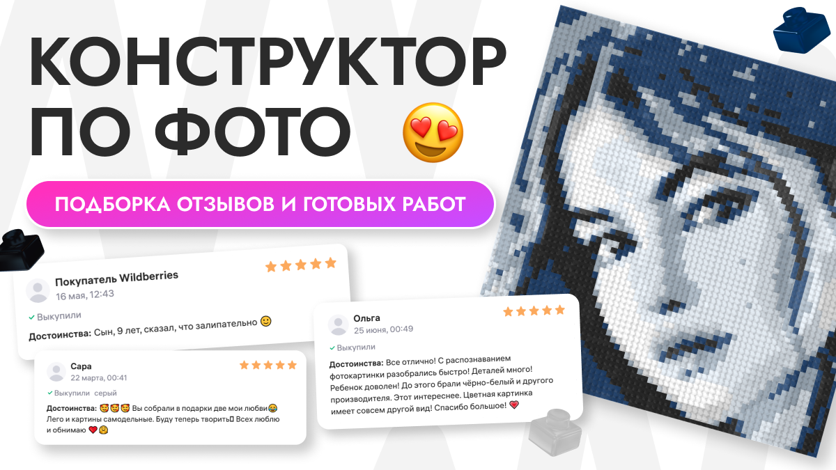 Конструктор по фото — набор для создания картины из кубиков конструктора. Теперь у вас есть возможность создавать уникальные и креативные композиции из кубиков конструктора (собирается из brick кубиков), превращая любое ваше фото или изображение в настоящее произведение искусства в стиле пиксель арт! Если собирали конструктор lego, то вам точно понравится конструктор по фото! Закажите набор на маркетплейсе и создай фото из конструктора! Друзья, спасибо за ваши теплые слова и фото готовых работ! Каждый отзыв вдохновляет нас делать продукт ещё лучше. 💖 Вот лишь несколько работ (листайте 👇). Посмотрите, как здорово получается! Хотите так же? Попробуйте и вы! Фото конструктор мозаика по фотографии 51x51 ЧБ — https://www.wildberries.ru/catalog/322963966/detail.aspx?targetUrl=EX Фото конструктор мозаика по фотографии 51x51 Сапфир — https://www.wildberries.ru/catalog/322963968/detail.aspx?targetUrl=EX Фото конструктор мозаика по фотографии 51x51 Винтаж — https://www.wildberries.ru/catalog