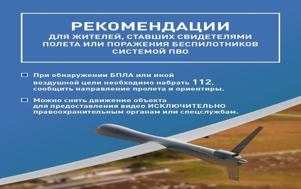 Если вы стали свидетелем полета или поражения БПЛА, важно придерживаться ряда правил безопасности. Как сообщили в ЕДДС города, если беспилотник атакует в вашем районе, первым шагом должно быть укрытие в ближайшем здании, паркинге или подземном переходе. В случае отсутствия укрытий, нужно лечь на землю и закрыть голову руками. Особенно это важно, если слышен свист падающего беспилотника. Кроме того, службы настоятельно рекомендуют не приближаться к обломкам дронов. Фотографировать или распространять такие снимки через социальные сети категорически запрещено. В случае визуального обнаружения в воздухе БПЛА необходимо оперативно сообщить в службу вызова экстренных оперативных служб по номеру «112» или в полицию по номеру «102» — написали в ЕДДС Краснодара.