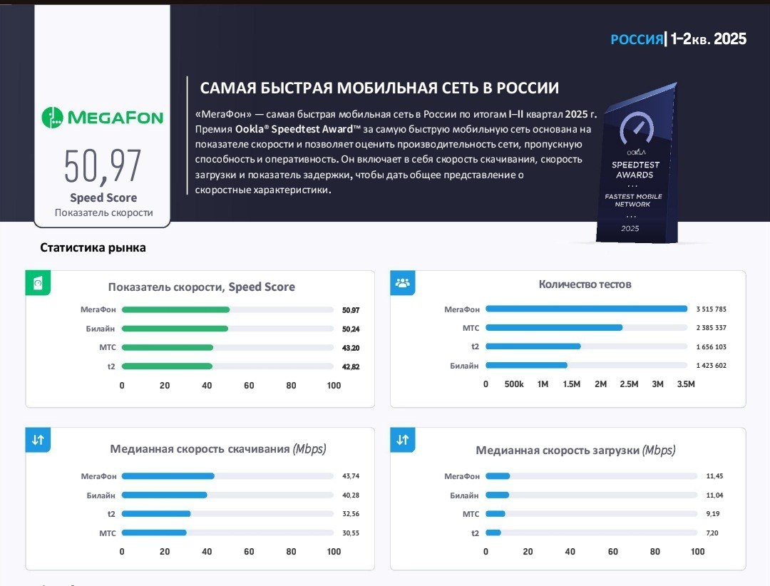 Отчеты Ookla: самый быстрый — МегаФон Согласно отчетам Ookla за I полугодие 2025 года МегаФон, в очередной раз, подтвердил звание "Самой быстрой мобильной сети в РФ". Рейтинг по скорости 1. МегаФон; 2. Билайн; 3. МТС; 4. t2. Рейтинг по медианной скорости скачивания 1. МегаФон; 2. Билайн; 3. t2; 4. МТС. Рейтинг по медианной скорости загрузки 1. МегаФон; 2. Билайн; 3. МТС; 4. t2. 📱 Про операторов | Подписаться