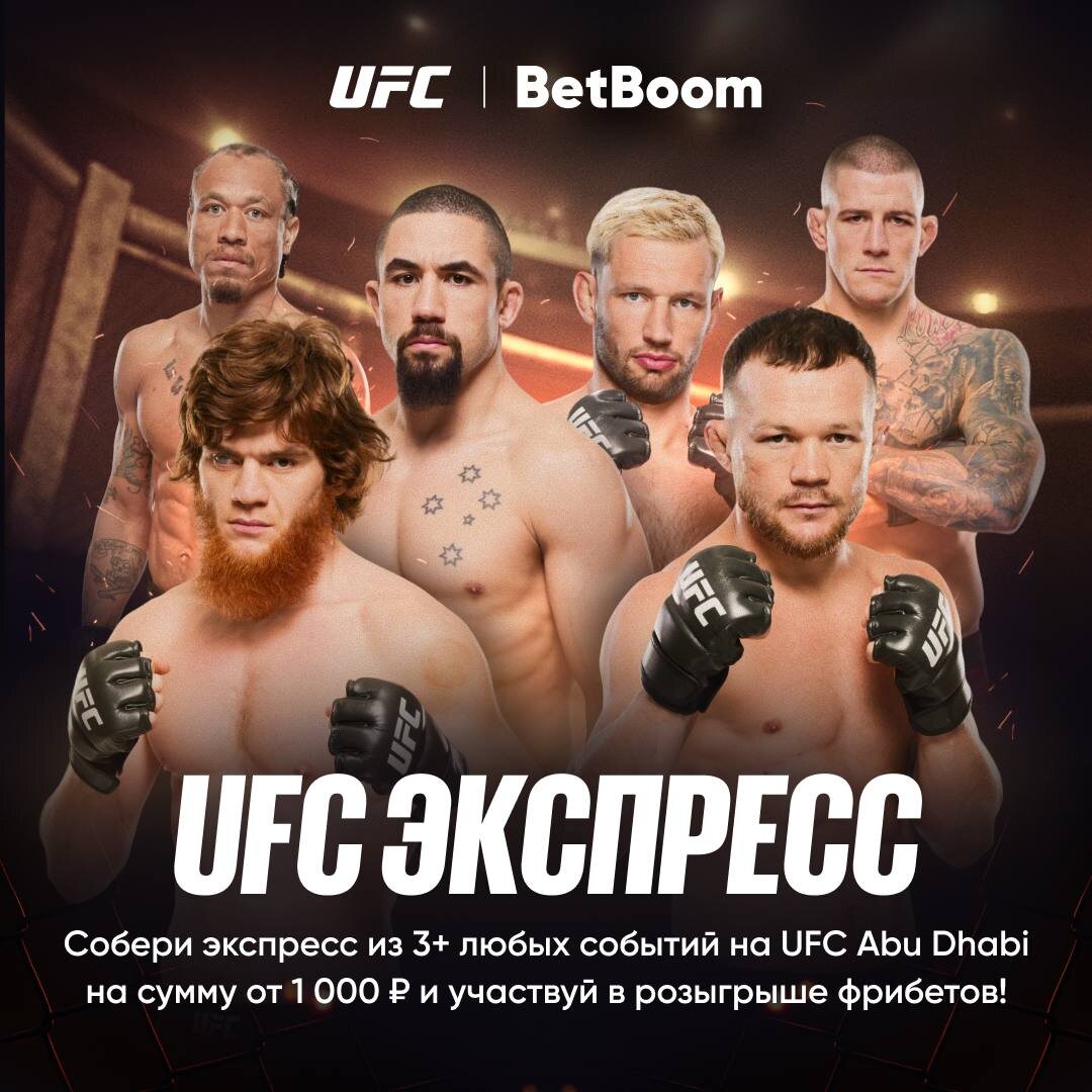 ❤️ Следим за топовым кардом UFC Abu Dhabi с крутой акцией от BetBoom 😉 Сначала об условиях: ✔️ Переходи по ссылке и жми кнопку Принять участие ✔️ Собери экспресс из 3+ событий на UFC Abu Dhabi на сумму от 1 000 😎 А теперь к призовому фонду: 1 место – 10 000 фрибетов 2 место – 5 000 фрибетов 3-25 место – 1 000 фрибетов It’s tiiiiime 🥊
