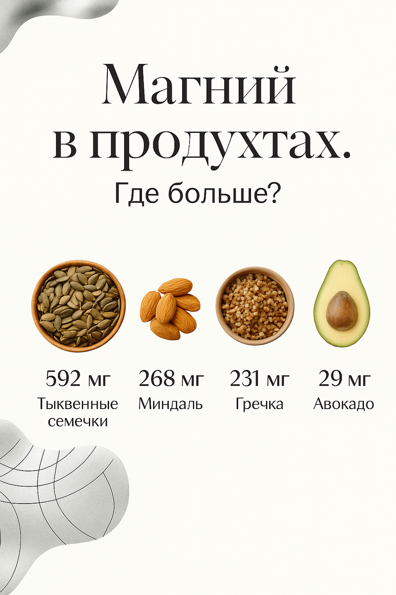 О магнии мы слышим часто: помогает при судорогах, снимает тревожность, улучшает сон. Но вот вопрос: если он содержится в еде — зачем пить добавки или принимать ванны с солью? Разбираемся, в каких продуктах магния больше всего, почему он может не усваиваться, и что делать, если вы чувствуете усталость, раздражительность и тревожность без причины. Вот список продуктов-лидеров по содержанию магния на 100 граммов: На первый взгляд — неплохо. Казалось бы, ешь миндаль с гречкой, запивай зелёным смузи — и всё будет в порядке. Но на практике всё не так просто. ❗ По данным обзора Nutrients (2021), около 50–70% населения испытывают недостаток магния. Причины: 💬 «Магний — ключевой кофактор в регуляции нейротрансмиттеров, включая ГАМК, и при его дефиците увеличивается риск бессонницы и тревожных расстройств»