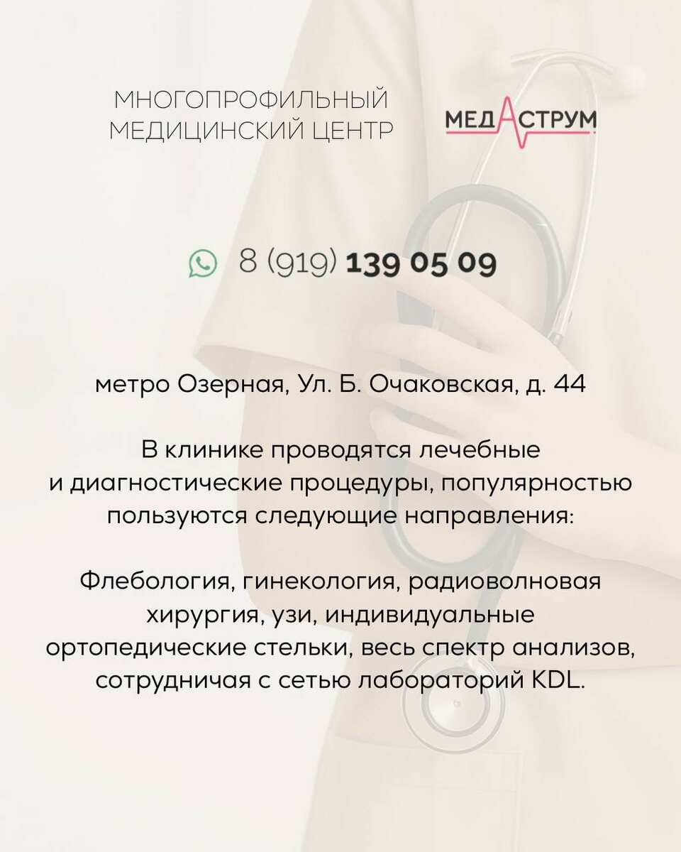 Приветствуем, вас от официального канала медицинского центра «МедАструм» МедАструм - квалифицированное лечение, современное оборудование, опытные врачи, забота о каждом пациенте. Центр на Юго-Западе Москвы, неподалеку от метро Озерная, Ул. Б. Очаковская, д. 44 WA : +7 919 139-05-09 В клинике проводятся лечебные и диагностические процедуры, популярностью пользуются следующие направления: Флебология, гинекология, радиоволновая хирургия, узи, индивидуальные ортопедические стельки, весь спектр анализов, сотрудничая с сетью лабораторий KDL. Приглашаем Вас проверить свое здоровье в медцентре «МедАструм» ЗАПИСАТЬСЯ
