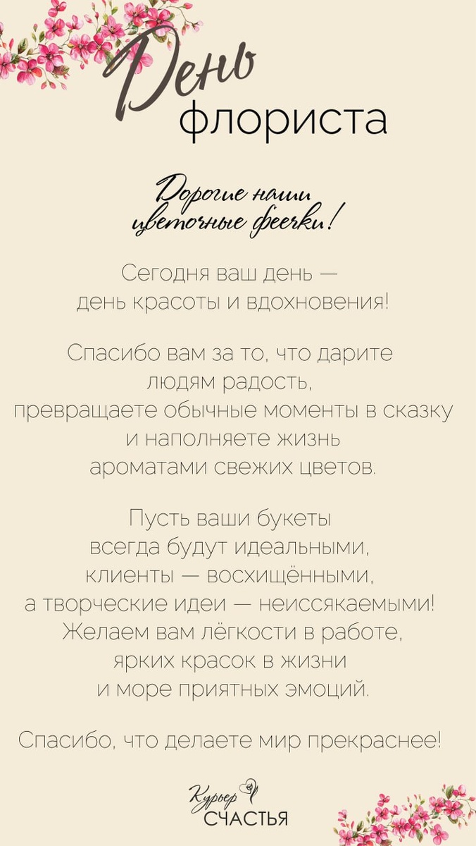 🤩 Дорогие флористы! 🤩 От всей души поздравляем вас с профессиональным праздником! Спасибо, что дарите миру столько красоты и тепла. С любовью, Ваш "Курьер Счастья" 🤩