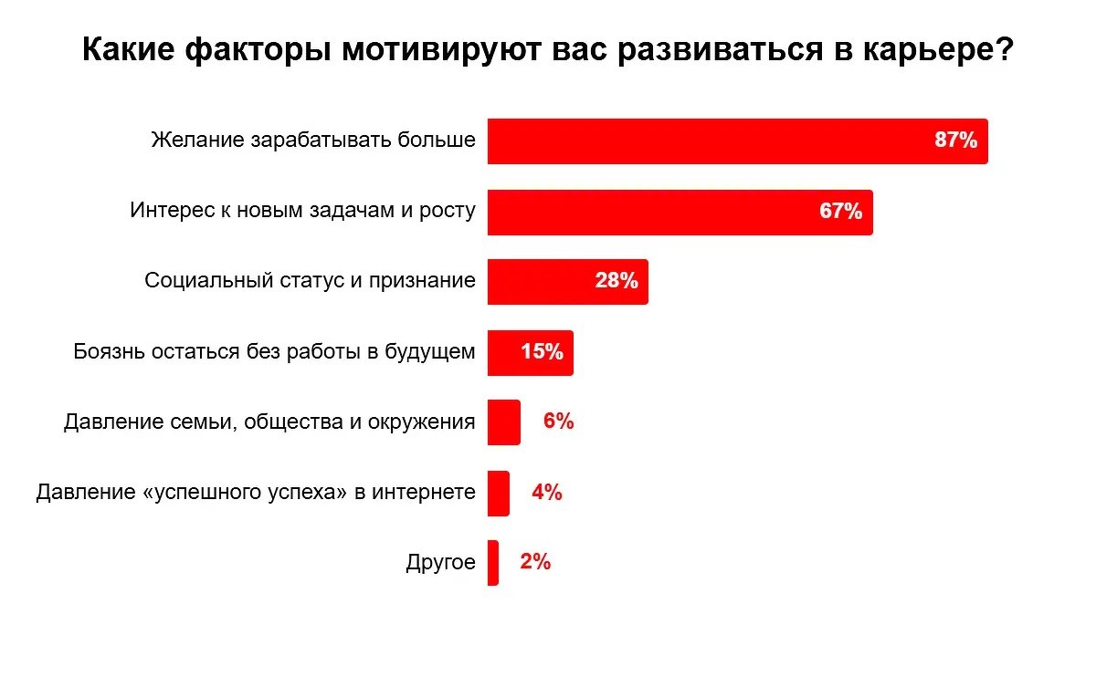 Опрос показал: россияне грезят о баснословных зарплатах (90%!), но и саморазвитие, признание и новые вызовы тоже важны (67%). Женщины чуть больше ценят похвалу, мужики — ощущают давление социума. Молодежь гонится за деньгами (92%), а зрелые дяди и тети — поскромнее (78%). В итоге, Мария Игнатова подытожила: деньги — это круто, но и кайф от работы тоже нужен!