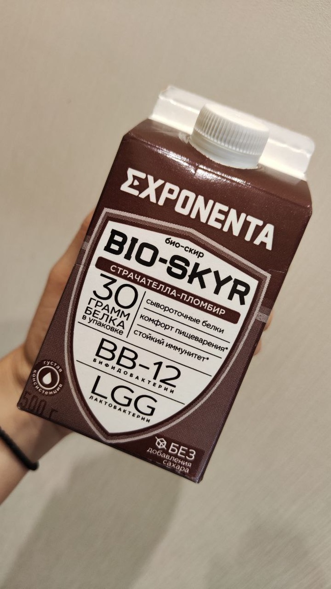 Всем хеллоу👋 Все-таки я решила дать второй шанс Экспоненте и уже взяла не кисломолочный напиток, а био-скир. Очень интересно, потому что скир до этого я пробовала в виде плотного йогурта🍒 Для меня этот вариант более подходящий, потому что по консистенции он поплотнее, плотность как у ряженки. Присутствует небольшая кислинка. По вкусу страчателла-пломбир. Немного не понимаю: это сыр должно было напоминать или отсылка к шоколадной крошке в мороженом?! Вроде бы присутствует вкус пломбирчика🍦 Вкус я бы описала так: небольшая кислинка, сменяющаяся сладостью. По итогу: иногда я буду брать такой скир, на перекус в дороге или когда ничего не приготовила, а голод уже зверский, тогда самое то👍