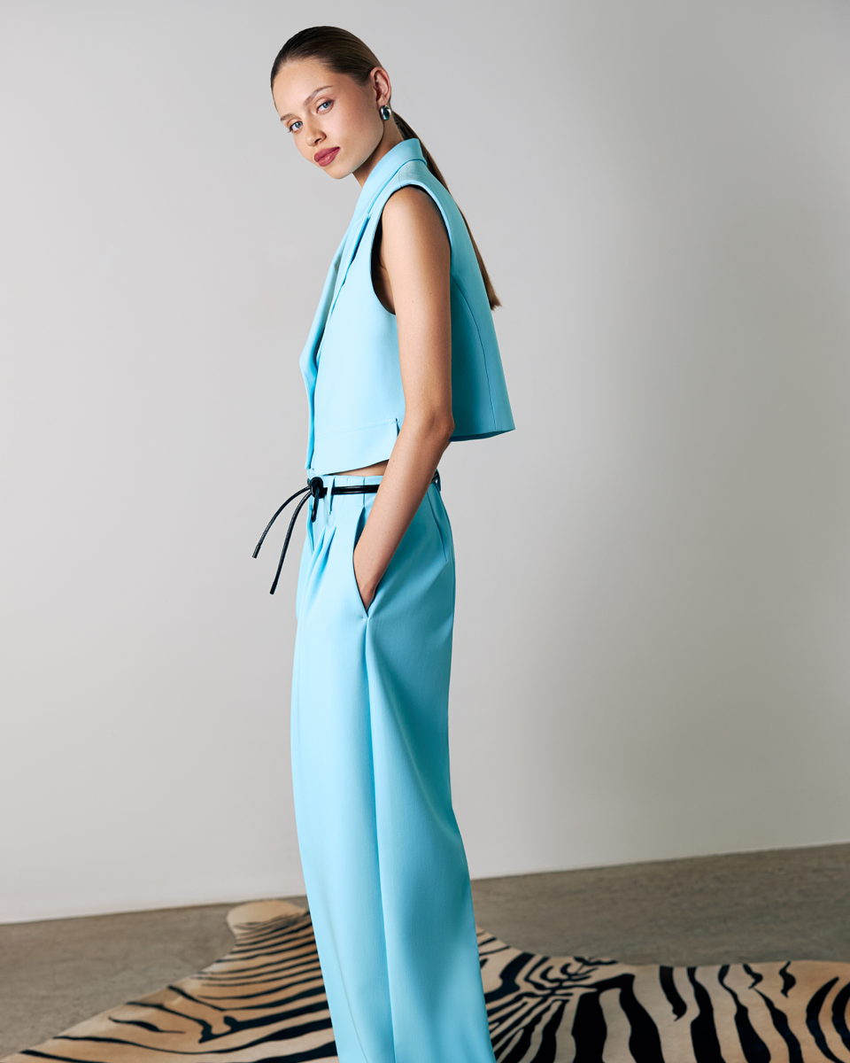Трендовый бирюзовый не оставляет равнодушным. Добавь к элегантному костюму пояс-шнурок, лакированную сумку и легкие босоножки — и образ становится невесомым даже в городе.