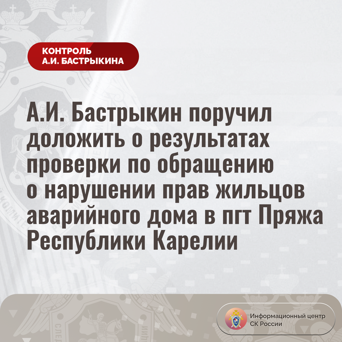 А.И. Бастрыкин поручил доложить о результатах проверки по обращению о нарушении прав жильцов аварийного дома в пгт Пряжа Республики Карелии В приемную Председателя СК России А.И. Бастрыкина «ВКонтакте» обратился житель поселка городского типа Пряжа Республики Карелии по вопросу нарушения его прав при переселении из многоквартирного дома на улице Советской. Он сообщил, что в 2017 году в связи со значительным физическим износом конструкций здание, 1935 года постройки, признано аварийным. Однако срок предоставления гражданам благоустроенного жилья, изначально установленный на 2019 год, постоянно переносится. В связи с небезопасными условиями проживания мужчина вынужден арендовать другую квартиру за свой счет, что для него финансово затруднительно. Многочисленные обращения в компетентные органы результатов не принесли. В СУ СК России по Республике Карелии по данному факту проводится процессуальная проверка. Председатель Следственного комитета Российской Федерации Александр Иванович Бастры