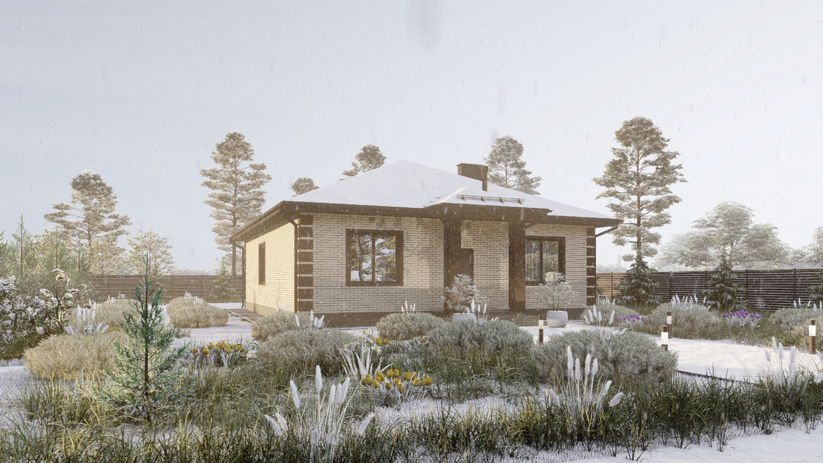Индивидуальная зона охватывает функции сна, занятий, личной гигиены, отдыха. Учитывая специфику бытовых процессов, в этой зоне обеспечена максимальная изоляция входящих в нее помещений. Спальные комнаты сгруппированы и находятся в дальней части дома. Здесь же располагается ванная комната и кладовая для хранения бытового инвентаря. Коллективная зона включает в себя входную группу (крыльцо и тамбур), переднюю часть холла, гостиную и кухню. При холле предусмотрен санузел. Крыльцо дома выполнено в виде н
