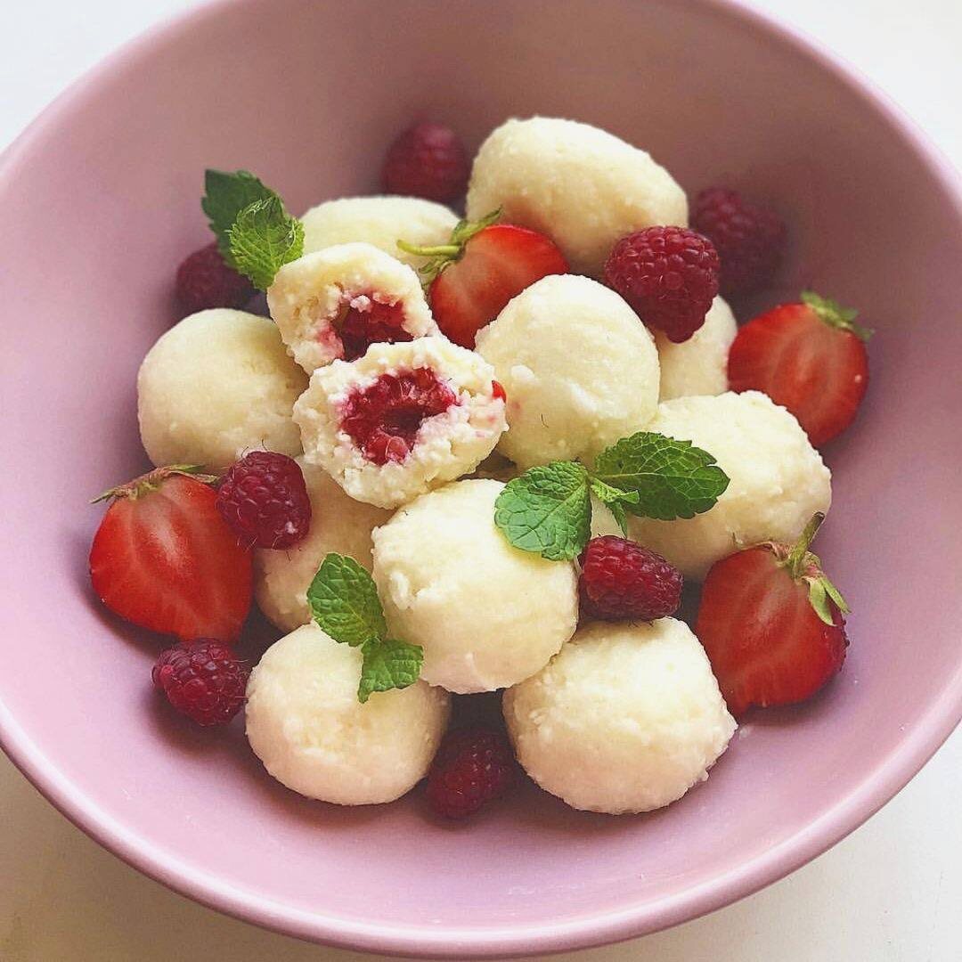 Творожные шарики с сюрпризом Ингредиенты: Творог в пачке 200гр 1 желток Рисовая мука ~ 1 ст.л Немного ванилина (можно добавить мак) Любые ягоды (для малышей режем наполовинки) Приготовление: Смешиваем творог, желток, ванилин и рисовую муку до однородной массы. Руками формируем шарики, делаем небольшое углубление и добавляем туда несколько ягодок. Закрываем наши шарики и бросаем в кипящую воду. Варим 4~5 минут. Вытаскивали после того, как всплыли на поверхность. По вкусу как ленивые вареники) Подавать можно с любым топпингом по возрасту малыша (сметана, варенье, фрукты, лепестки миндаля, орешки) Самые вкусные рецепты храню здесь. Приятного аппетита!🍓