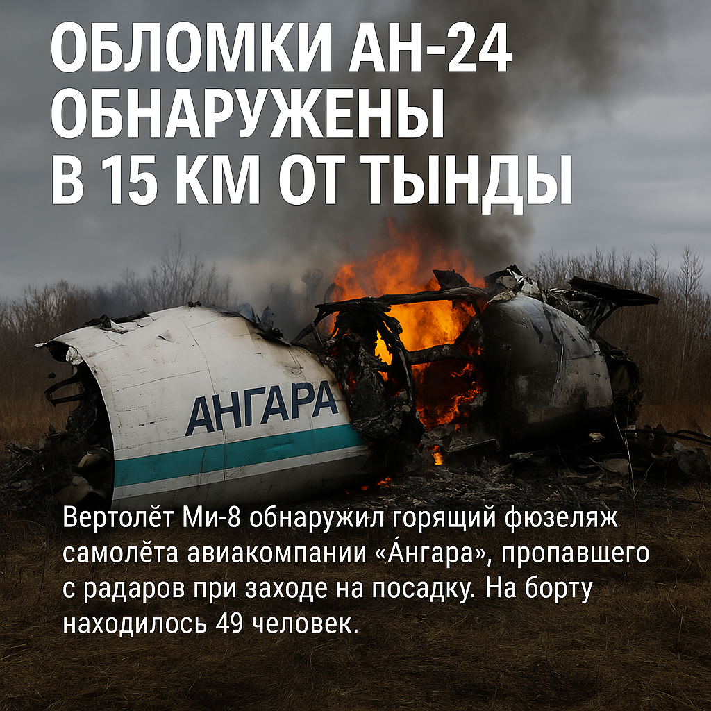🚨 В 15 километрах от города Тында (Амурская область) были обнаружены обломки самолета АН-24 авиакомпании «Ангара», следовавшего по маршруту Хабаровск — Благовещенск — Тында. Вертолет Ми-8 Россавиации нашёл горящий фюзеляж, сообщает МЧС со ссылкой на экстренные службы. Связь с самолётом прервалась около 8:40 мск, когда он заходил на второй круг перед посадкой. На борту находились 49 человек — 43 пассажира (включая пятерых детей) и 6 членов экипажа. В настоящий момент информация о их судьбе отсутствует. Следственный комитет уже возбудил уголовное дело по факту происшествия.