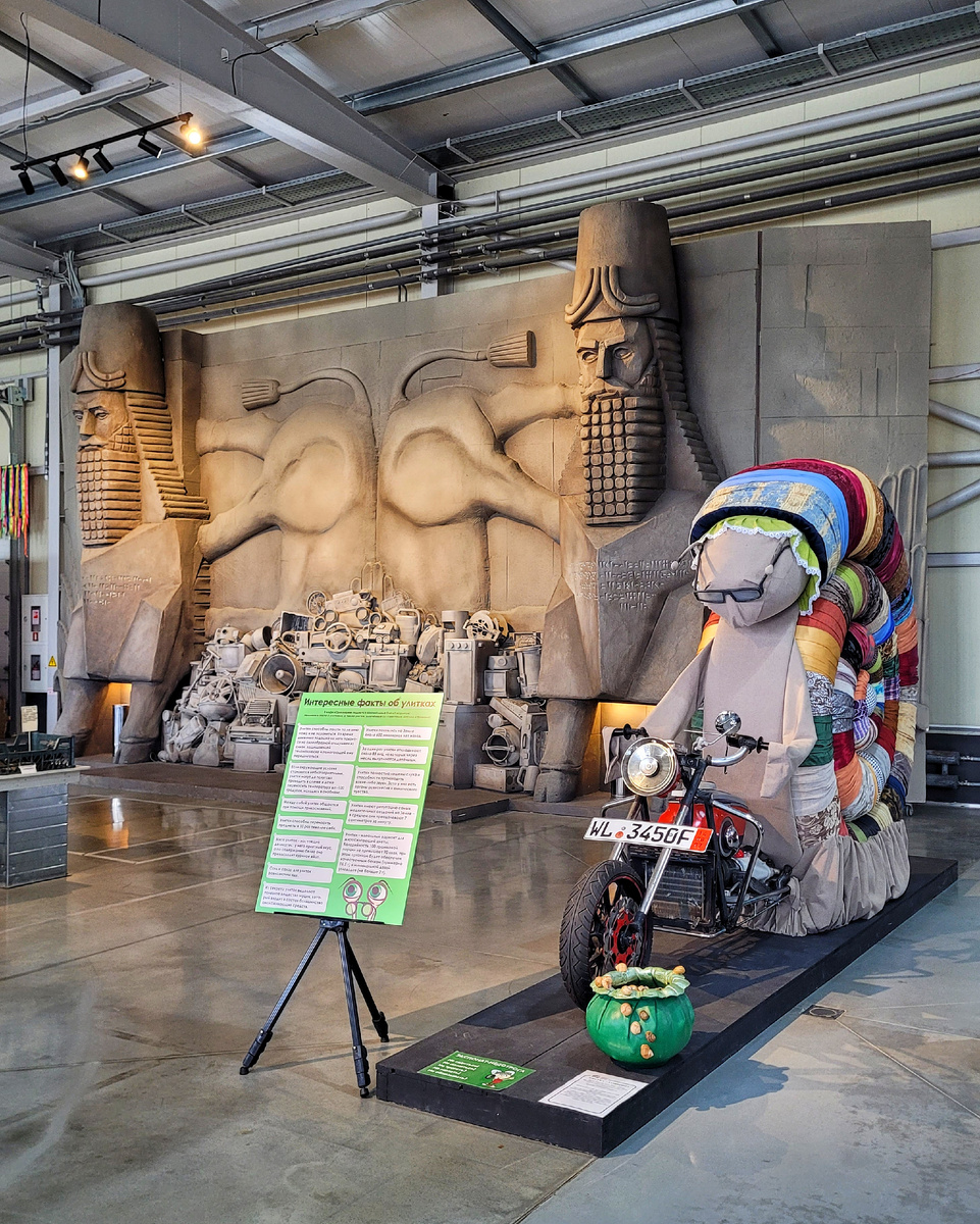 Вообще сначала были отели, офисы и жилые дома. Их созданием занималась московская арт-группа «BÜRO» во главе с Ириной Клочковой. И за годы работы у них накопилось много ненужного: бытовая и офисная техника, мебель, обрезки тканей и прочее — выбросить всё это было жалко. ...целый ангар-склад площадью в 1000 квадратных метров. А люди-то творческие — они начали использовать старые вещи в создаваемых интерьерах. И это стало фишкой креативной команды. Только со временем хлама становилось всё больше — так и возникла идея «МУ МУ». ...художественный МУзей МУсора появился в декабре 2015 года в Калужской области — в этом году ему стукнет 10 лет. Хотя казалось бы! Ну как можно привлечь народ и продержаться так долго на пластиковых бутылках и полиэтиленовых пакетах? А вот можно! Создатели сумели сделать классное пространство для всей семьи. ...Увидеть, Узнать, Удивиться. Или — Узнать, Удивиться, Улыбнуться. Внутри не только арт-объекты из мусора — диваны из яичных коробок, платья из презервативов,