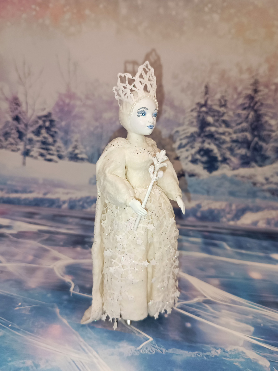 Приветствую, друзья, на очередном этапе творения Снежной Королевы! Платье уже закончено, готовы пышная юбка и рукава. Но сказочная барышня не может носить простое платье, пусть она и придерживается снежно-сдержанного стиля, однотонного и строгого. Но как раз зимняя стилистика дарит возможность пофантазировать и украсить наряд Королевы узорами из снежинок. Снова не помощь пришла моя любимая машинка для вырубки с ножами! Из ватной бумаги я нарезала побольше ажурных снежинок: Голову куколки я предварительно выровняла, создав некое подобие гладкой шапочки. Теперь приступим к сборке короны. Большую снежинку я разделила на отдельные лепестки и из них стала склеивать головной убор: Лепестки очень тонкие, легко деформируются под воздействием влаги, поэтому работать нужно очень аккуратно, стараясь не порвать тонкие переплетения. На этом этапе работы я использовала клей ПВА, а не клейстер, чтобы надежнее скрепить корону с головой Королевы. Пока корона похожа больше на кокошник в народном стиле,