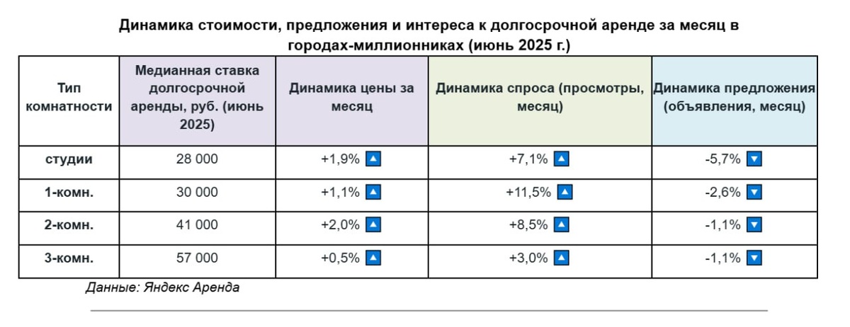 "В течение июня число сдаваемых студий в городах-миллионниках снизилось на 5,7%, однокомнатных квартир — на 2,6%, двухкомнатных и трехкомнатных — на 1,1%. В первую очередь из экспозиции выходят наиболее недорогие квартиры, что и приводит к небольшому росту стоимости в течение июня. При этом в некоторых мегаполисах стоимость отдельных форматов все еще продолжает умеренно снижаться в цене. Более ощутимый рост в цене одно- и двухкомнатных квартир в миллионниках объясняется особой популярностью этих форматов".