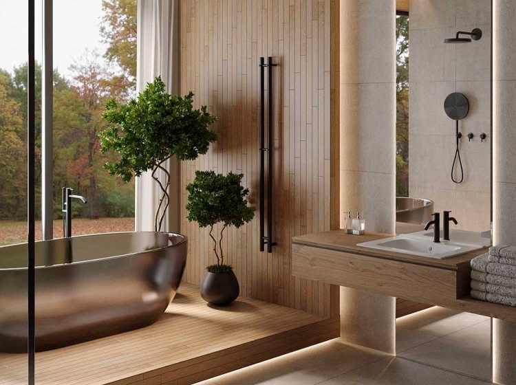Как стильно обыграть дизайн плитки под дерево в ванной?