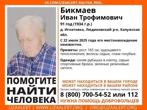Иван Трофимович Бикмаев ушёл из дома в деревне Игнатовке Людиновского района 22 июля. Описанием пропавшего поделились в поисково-спасательном отряде «ЛизаАлерт». Мужчина находится в преклонном возрасте, ему 91 год. В последний раз его видели в синей рубашке в клетку, серых спортивных брюках и зелёных резиновых сапогах. Его рост – 165 сантиметров, пенсионер худощавого телосложения, у него седые волосы и голубые глаза. Любую информацию о местонахождении пропавшего можно сообщить по телефону горячей линии 8-800- 700-54-52 (бесплатно на территории РФ). Сергей Ус / Калуга Сегодня, Поисковый отряд "ЛизаАлерт" Калужской области
