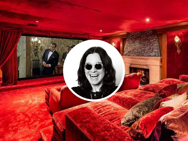 Домашний кинотеатр, обитый красным бархатом, расположен на -1 этаже. В нём есть камин и бар, а эстетика напоминает старый Голливуд. Над камином висит меловая доска с автографами знаменитостей: Линна Редгрейва, Натали Вуд, Мел Торм, Риты Морено и Нэнси Синатры.