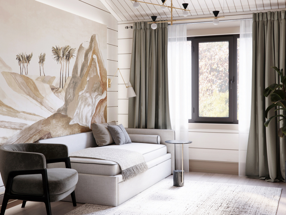 В этой части дома расположена спальня для бабушки. Комната оформлена в спокойной, светлой палитре — мягкие серые и бежевые тона подчёркивают ощущение уюта и покоя. Здесь мы разместили кровать размером 100×200 см с мягким изголовьем, рядом — прикроватную тумбу с бра в латунной отделке. В зоне хранения — вместительный платяной шкаф с распашными дверцами и выдвижными ящиками в нижней части. На противоположной стене — тумба с телевизором, напольный светильник и зеркало в изящной овальной раме. Завершает композицию удобное кресло и журнальный столик на чёрном мраморном основании. Акцентной деталью стали обои с пейзажем, мы задумали там контурную подсветку чтобы усилить визуальный эффект. Из комнаты открывается вид на участок через большое окно, обрамлённое тяжёлыми шторами и лёгким тюлем.