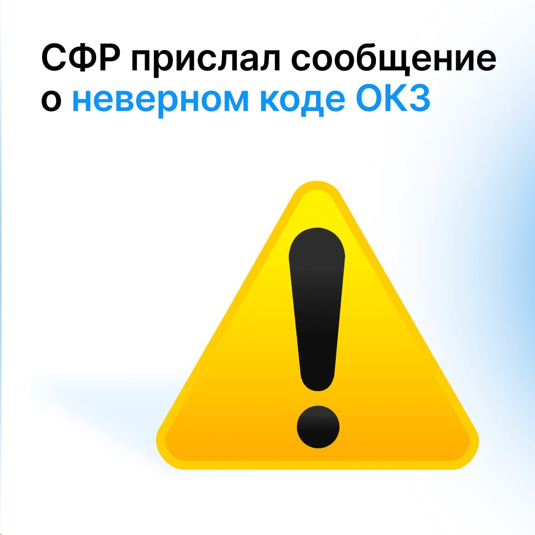 ⚠️ Важно! СФР прислал сообщение о неверном коде ОКЗ: что делать Некоторые пользователи получают от СФР уведомления, что допущена ошибка в коде по Общероссийскому классификатору занятий (ОКЗ) в отчетах ЕФС-1 и СЗВ-ТД. 💭 Что произошло СФР совместно с экспертами Минтруда усилил проверку правильности заполнения кодов ОКЗ. Разбираемся, как действовать: 1️⃣ Если ошибка действительно есть: отправьте корректировку ЕФС-1 или СЗВ-ТД 2️⃣ Если код ОКЗ указан верно: напишите в СФР пояснительное письмо в свободной форме — сообщите, что корректировка не требуется, код указан корректно. Для клиентов Saby есть инструкции по корректировке отчетов: ⏺Как откорректировать код ОКЗ в СЗВ-ТД ⏺Как внести исправления в ЕФС-1 Пищите вопросы по проблеме в комментариях — постараемся всем помочь❤️ 📱 Saby для бухгалтеров #Saby_Полезное