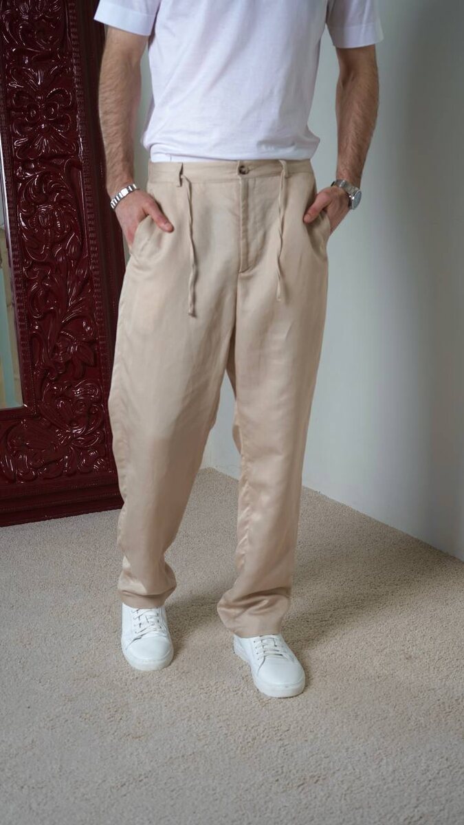 Льняные брюки на завязках это идеальный вариант для тех, кто хочет выглядеть красиво и собрано Что в них особенного? – Лёгкий лён, дышащий и приятный к телу даже в жару. – Универсальный бежевый оттенок, легко сочетающийся с белыми, серыми, чёрными и пастельными футболками, рубашками и поло. – Завязки дают расслабленную посадку и комфорт, сохраняя стильный силуэт. – Их можно носить с футболкой и кедами или с лёгким пиджаком и сандалиями — для стильных летних выходов и путешествий. Эти брюки становятся базой летнего гардероба, помогая создавать минималистичные, свежие образы на каждый день.