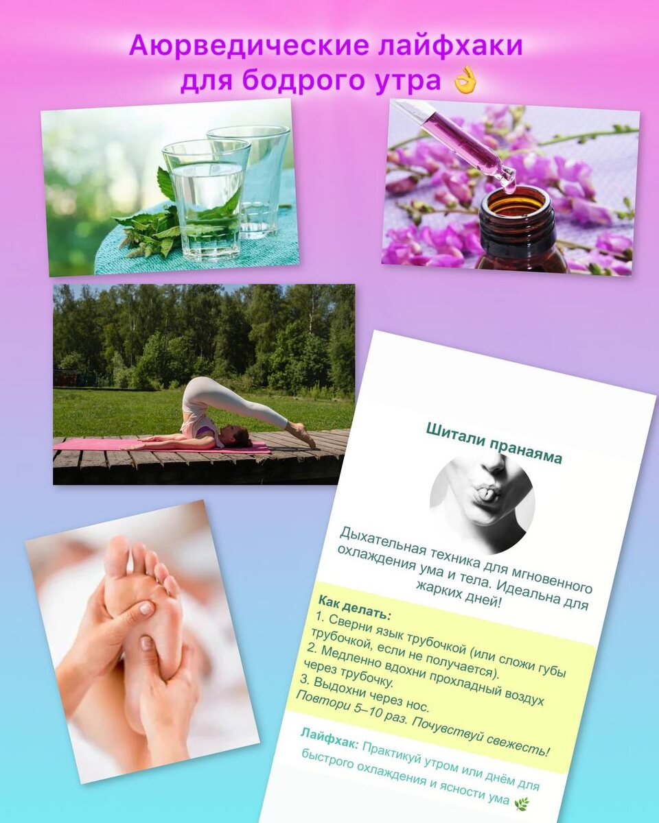 💦 Начни утро с прохладной воды Почему: летом доминирует Питта (огонь), а значит, важно охлаждать организм. ➕: Гидратация, очищение организма, мягкий "запуск" ЖКТ.Мята и 🍋 для вкуса 👌 🚿 Утренний душ с натуральными маслами Почему: тело ночью перегревается, а душ снимает лишнее тепло. ➕: уберет вялость, улучшит настроение и сбалансирует Питту. Несколько капель масла сандала, мяты или розы в гель для душа — охладят и взбодрят. 💆 Массаж головы и стоп (Абхьянга) Почему: Аюрведа рекомендует утренний самомассаж особенно Капхе для улучшения циркуляции крови и лимфы. ➕: Снимет жар, укрепит и успокоит нервную систему особенно Вате, зарядит энергией. 2-3 минуты, массаж головы и/или стоп кокосовым или кунжутным маслом (лучше слегка охлаждённым, техника в закрепе) 😤 Дыхательные практики — Шитали Почему: специальная "охлаждающая" техника из йоги. Как делать: Сверни язык "трубочкой", вдыхай через него прохладный воздух, а выдыхай через нос. Повтори 5-10 раз. ➕: Быстро снимет внутреннее тепло, да