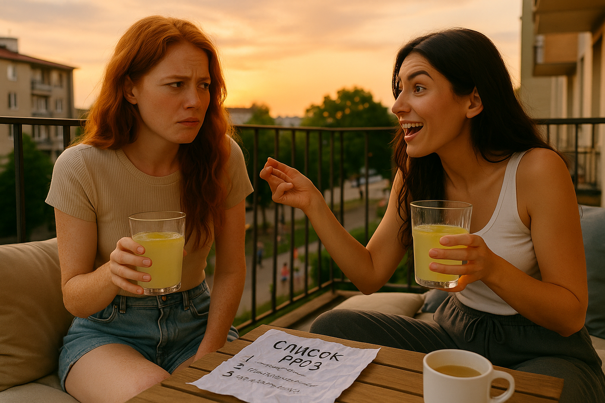 Таня и Лера сидели на балконе Лериной съёмной квартиры, потягивая холодный лимонад. Июльский вечер был тёплым, а внизу по улице носились дети, визжа от радости. Их «Список проказ» лежал на столе, весь исчёрканный и помятый, но всё ещё полный идей.