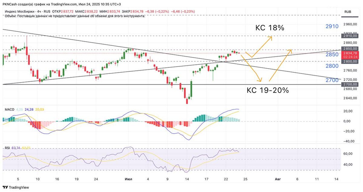 Вчера Росстат опубликовал статистику, где инфляция составила -0,05% за неделю. После такого сомнения по понижению КС сразу отпали Завтра понижение до 18%, так как 19% роли не сыграет, а оставлять 20% это сильное давление на экономику и только может все ухудшить в разы, 17% вряд ли, это слишком много на 3 пт. за раз. ЦБ ни раз говорила о плавном снижение, что бы не перегнуть в обе стороны. Затем 12 сентября остается 18%, 24 октября мы увидим скорее всего понижение снова на 2 пт. до 16%, но тут уже смотрим исходя из статистики и экономики в целом и 19 декабря снижение на 1 пт. до 15%, тем самым прогноз крупных аналитиков будет выполнен Опять же, можем мы увидеть 19 декабря 16% или 14%, да можем, как отряд других цифр. Все зависит от совокупных факторов, на пол года вперед сказать тяжело, но я вижу район 15% - 19 декабря. Про рынок пока новых мыслей нет, все те же ключевые уровни: сопротивление 2850, вчера пробить не смогли, поддержка 2800, в пределах этих уровней боковик. Все чт