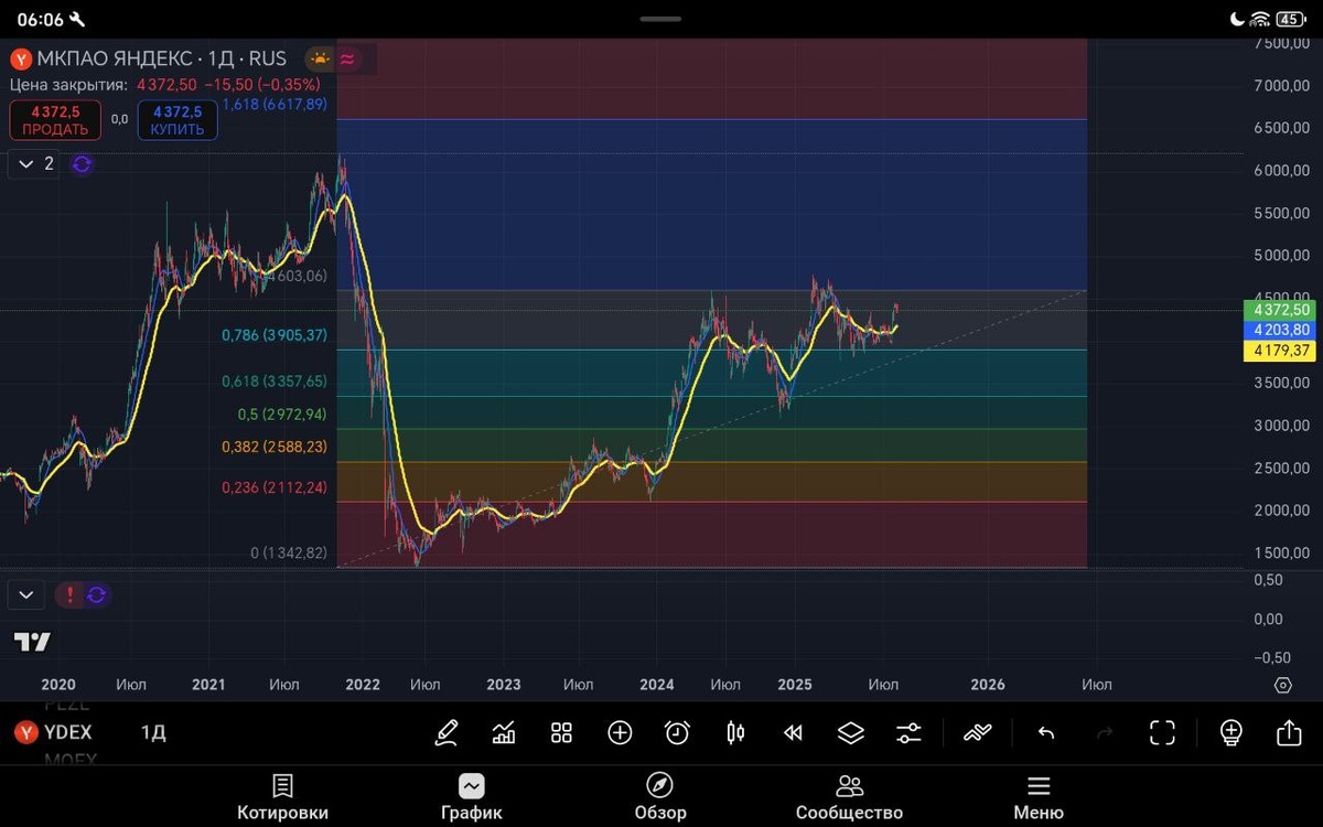 $YDEX 📈Тренд краткосрочные исходящий. 📊По тренду по Фибоначи построил две волны и упирался в сильный уровень сопротивления, который пробить со второго раза не смог – 4600. ➡️Как только пробьет этот уровень и закрепится, пойдёт строить третью волну. Конец третьей волны 6 600. ✔️Актив прекрасно подходит для среднесрочной инвестиции. 🔽Поддержка 3 905, отсюда оттолкнулся последний раз. Не Иир